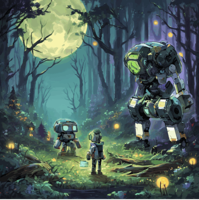 「Two Robots are watching the full moon in the deep forest」