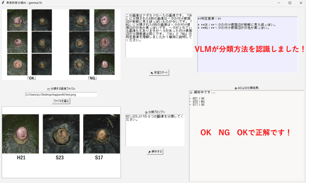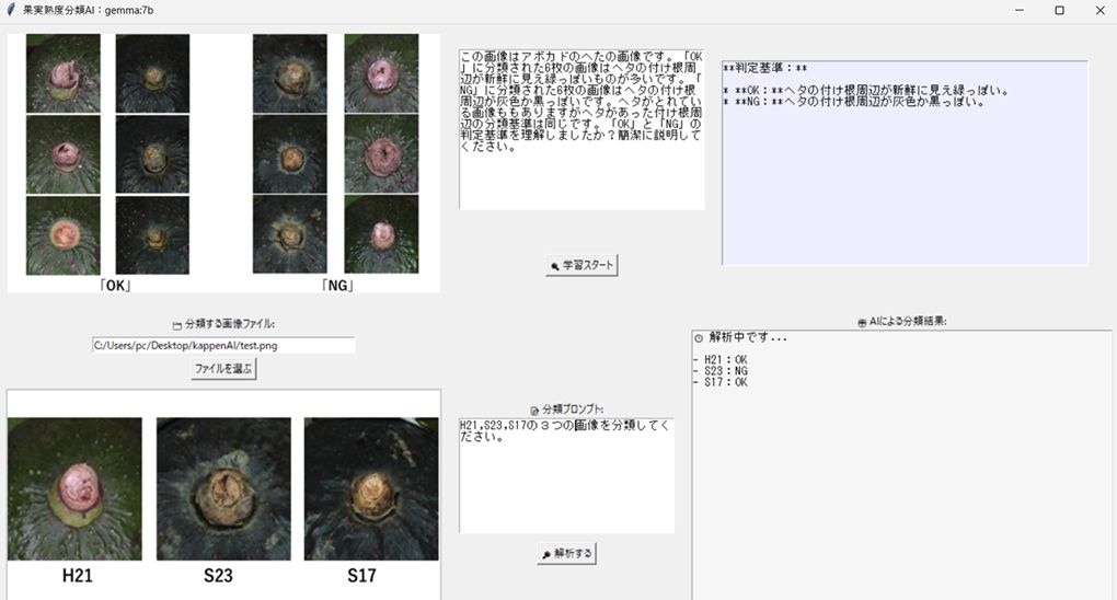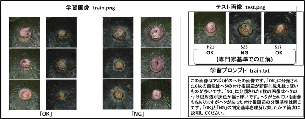 専門家により褐変ありなし(NG/OK)の分類を行いました。学習画像は「OK」「NG」それぞれ6枚を使いました。また学習プロンプトは、”この画像はアボカドのへたの画像です。「OK」に分類された6枚の画像はヘタの付け根周辺が新鮮に見え緑っぽいものが多いです。「NG」に分類された6枚の画像はヘタの付け根周辺が灰色か黒っぽいです。ヘタがとれている画像ももありますがヘタがあった付け根周辺の分類基準は同じです。「OK」と「NG」の判定基準を理解しましたか?簡潔に説明してください。“としました。