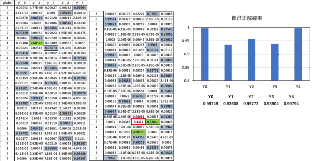 検証画像60枚の推論結果を示します。カテゴリの正解率は59/60で良好な結果が得られました。混同行列の対角成分(自己正解確率)を計算しました。Y0(C0:硬い)よY4(C4:過熟)の正解確率は非常に高いのですが、その中間のY1,Y2,Y3の正解確率は低く中間段階の分類の難しさが理解できました。