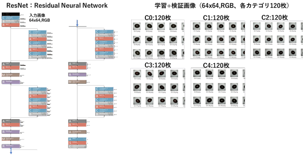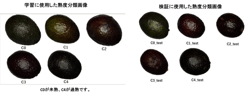アボカドは未熟なものは緑色です。時間がたつと茶褐色に変色し柔らかくなり食べられなくなります(過熟)。以下のようにプロの選別者が5分類(未熟C0,過熟はC4、その間をC1,C2,C3に分類)したアボカドの画像各108枚を学習データに使用しました。学習には、Sony製NNCでResNetを使用しました。検証には同じカテゴリの学習に使用してない画像各12枚を学習後のモデル精度検証に使いました。