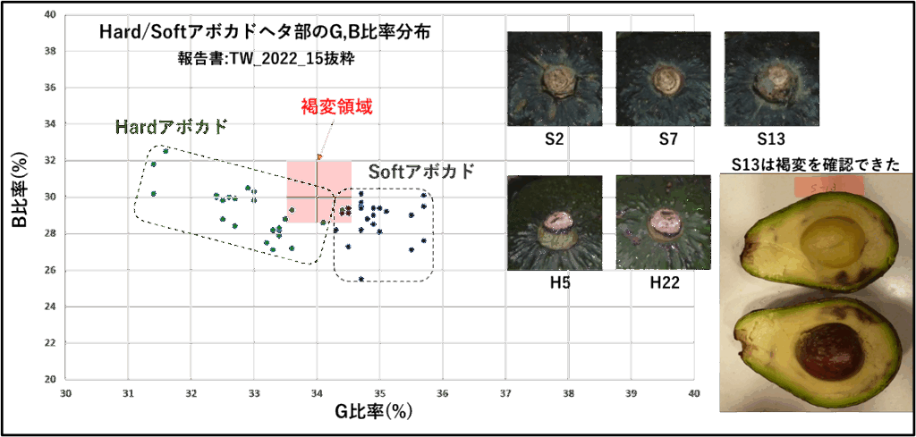 次の画像分類はアボカドヘタ部の褐変検出の例です。アボカド熟度はC0~C4で色と表面の模様からVLMが判定しましたが、アボカドの腐敗は多くの場合ヘタからの細菌の侵入により起こるといわれています。ヘタの周りの色味と感触を診て人間が判断しています。素人には判りずらいです。熟度には関係なく固いアボカドと柔らかいアボカドの中に含まれています。ヘタ周りの色分解データを使って分離をしようとしたこともありますが、ヘタとヘタ周辺の領域分離が難しく断念した経緯があります。