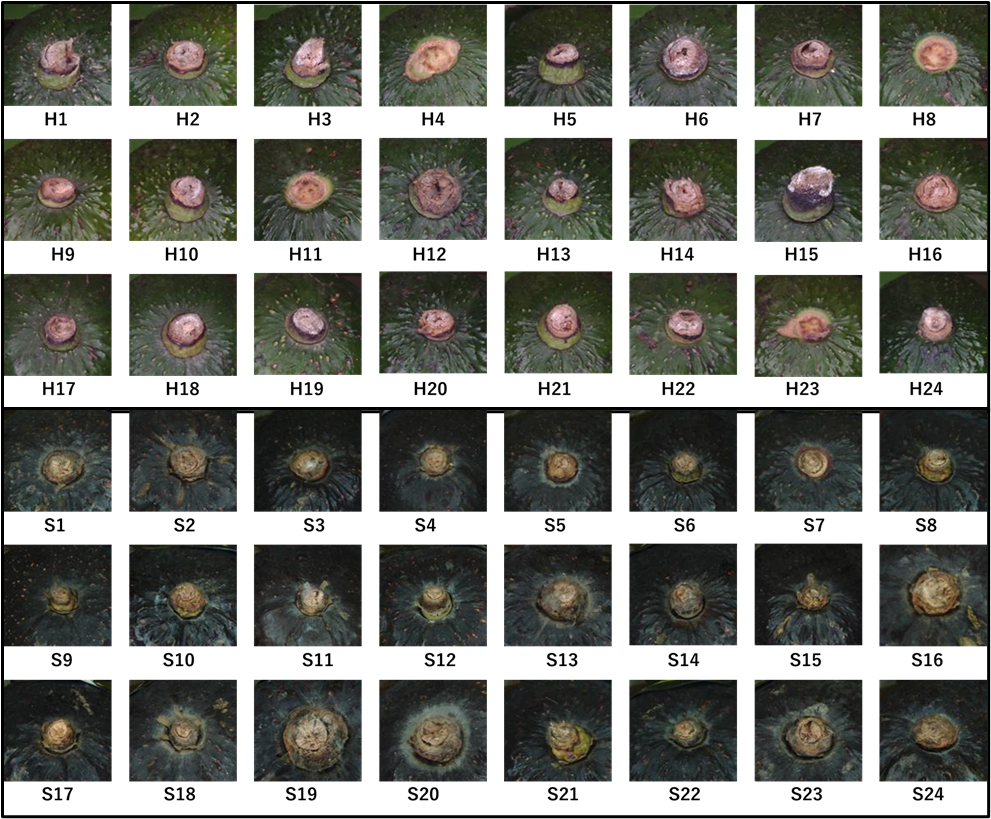固いアボカドと柔らかいアボカドのヘタ周りの写真を示しますが、ヘタがとれているものもありますが、ヘタの周辺が黒っぽくなっていると褐変の可能性が高いといわれています。(Hは固いアボカド、Sは柔らかいアボカドです。)