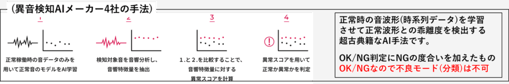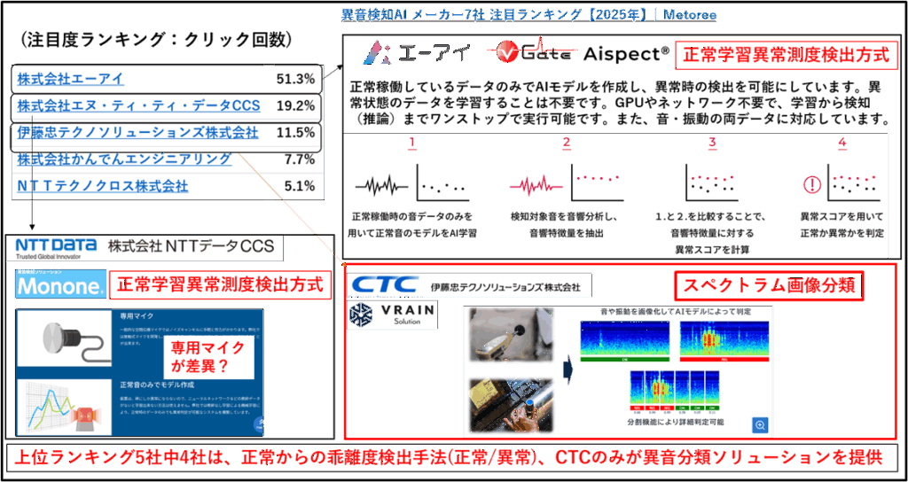 音による異常検知を生業にしている日本のTOP10メーカーという情報がありました。ランキングは、クリック回数という怪しい指標ですが、上位5社中4社はマイクをセンサにして異常測度を検出しているだけでした。正常か異常かの判定と、異常の度合いがどの程度か検出するだけでも生業になるんですね。1社だけCTC(BrainSolution)という2021年ころにぽっとでの自動車会社関係のベンチャーがスペクトラム解析をしているようです。音を可視化すると分類がし易いのかもしれません。本業は画像AI系の欠陥検査でしたか。