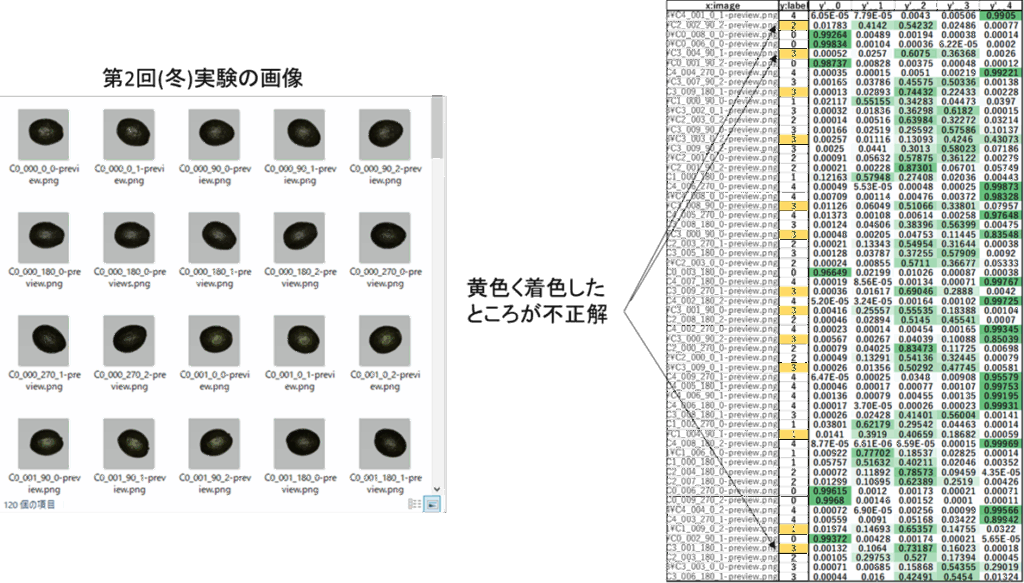 ところが、第1回実験(夏)で生成した分類モデルを使って第2回実験(冬)画像からランダムに抽出した60枚の画像を使い熟度を推論させてみました。分類正解率は47/60 =78%に低下してしまいました。(98%→78%)