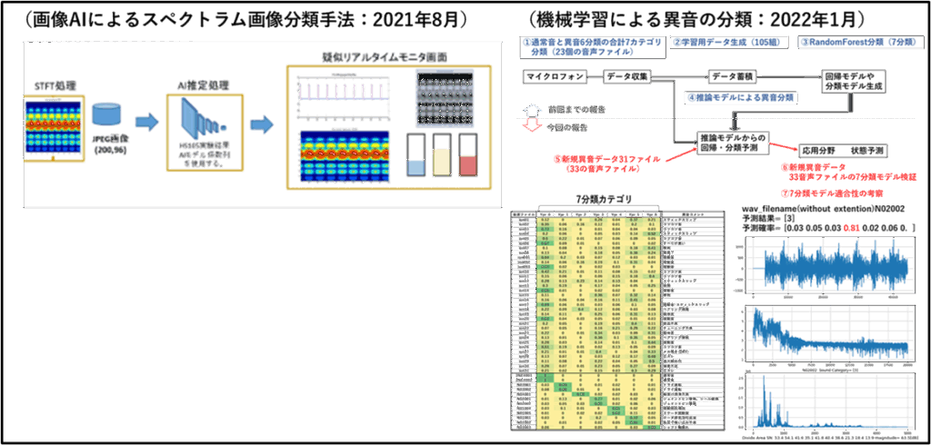 まず、異常検出でなく異常モード分類の手法を説明します、DeepLearningと機械学習が一般的です。CTC社のように音響スペクトラム画像でDeepLearningを利用した画像分類や複数の特徴値を利用した機械学習による分類が一般的です。どちらも2021年や2022年の段階で検討しています。センサとマイコンを使用したリアルタイムの異常検出や異常分類については、音声分類システム | TWINKLE TECやInteligentSensorのGUIプログラム | TWINKLE TECやハンドミキサーのモータ負荷状態測定システム | TWINKLE TECなどで取り上げています。また、別の機会に詳しく説明したいと思います。