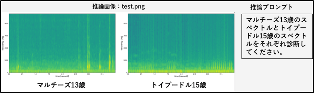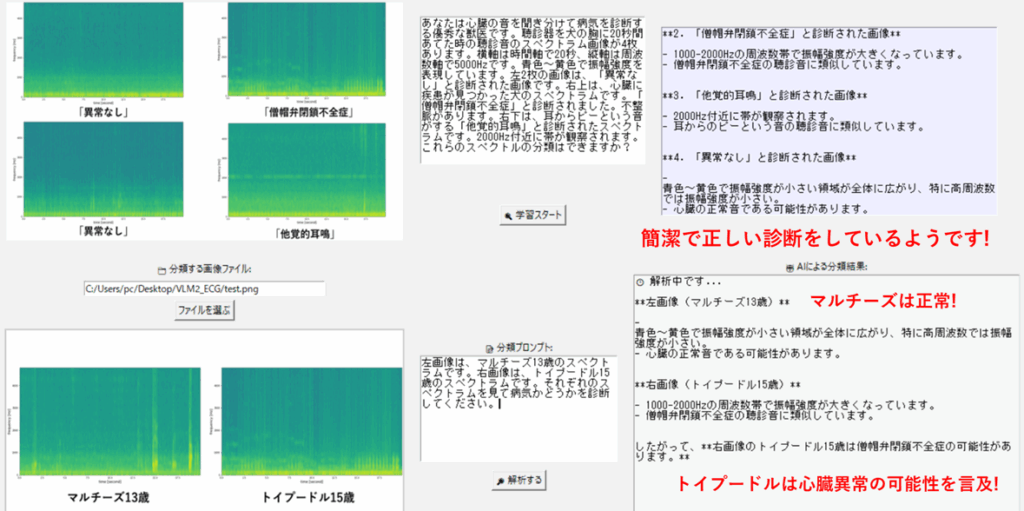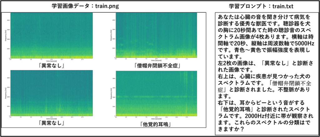 獣医さんの協力で、6頭の犬の心拍スペクトラムを収集しました。このうち2例は、心臓異常な犬と他覚的耳鳴りと判断された犬のものです。その他4例は特に異常なしと判断されましたが、正常な老犬のスペクトラム1件(マルチーズ)と心臓異常(トイプードル)を検証用に利用しました。VLMに与える学習画像と学習プロンプトを以下に示します。