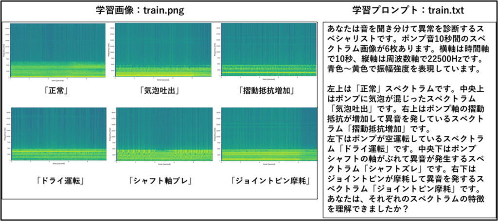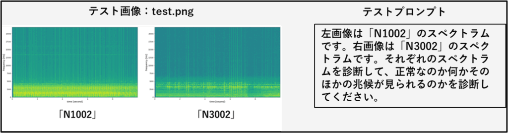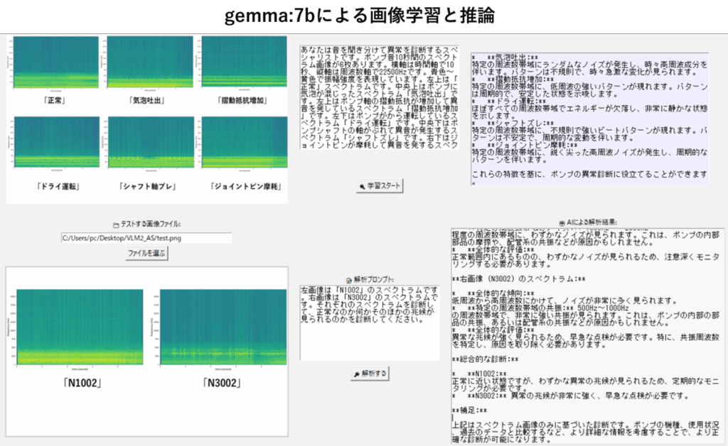 最後の応用例です。過去に異音分類で使用した音声データのうち、特徴的な5スペクトラムと正常スペクトラムを学習画像として使いました。学習プロンプトで画像に付加情報を与えます。使用するVLMは「gemma:7b」と「gemma3:12b」です。
