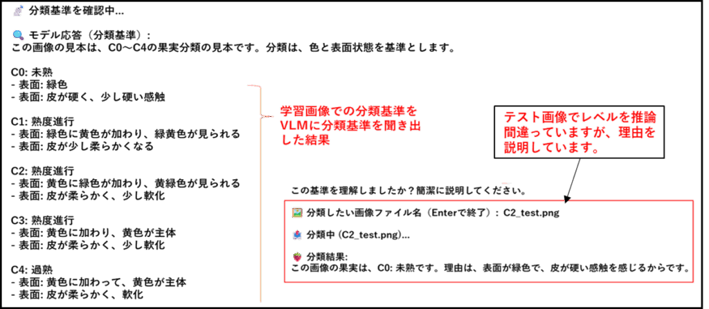 C0~C4の検証画像での正解率は5/5でした。以下C1とC2の検証画像を見せ、プロンプト“この画像から熟度のカテゴリーを推定してください。”と与えた場合のVLMからの回答を示します。分類の根拠も述べてくれます。従来の画像AIとは一線を隔しています。人間に近い感覚で分類しています。