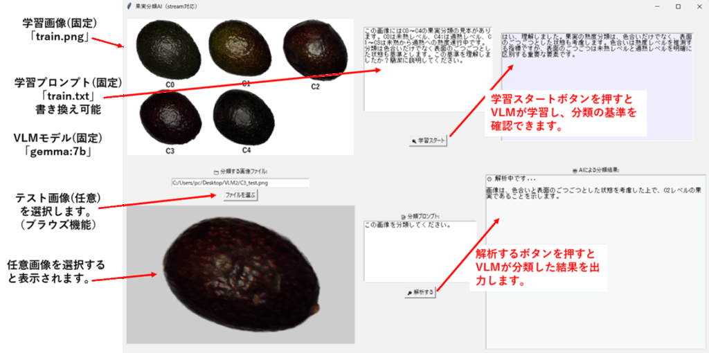 GUIの上半分が学習ステップです。左から学習画像、学習プロンプト、AIの分類確認コメントです。GUIの下半分は、左側から検証用画像(ブラウズできます)、分類指示プロンプト(複数枚の画像を分類する場合は、プロンプトの内容を編集してください)、分類結果と理由が表示されます。GUI下半分(推論)は繰り返し操作ができます。